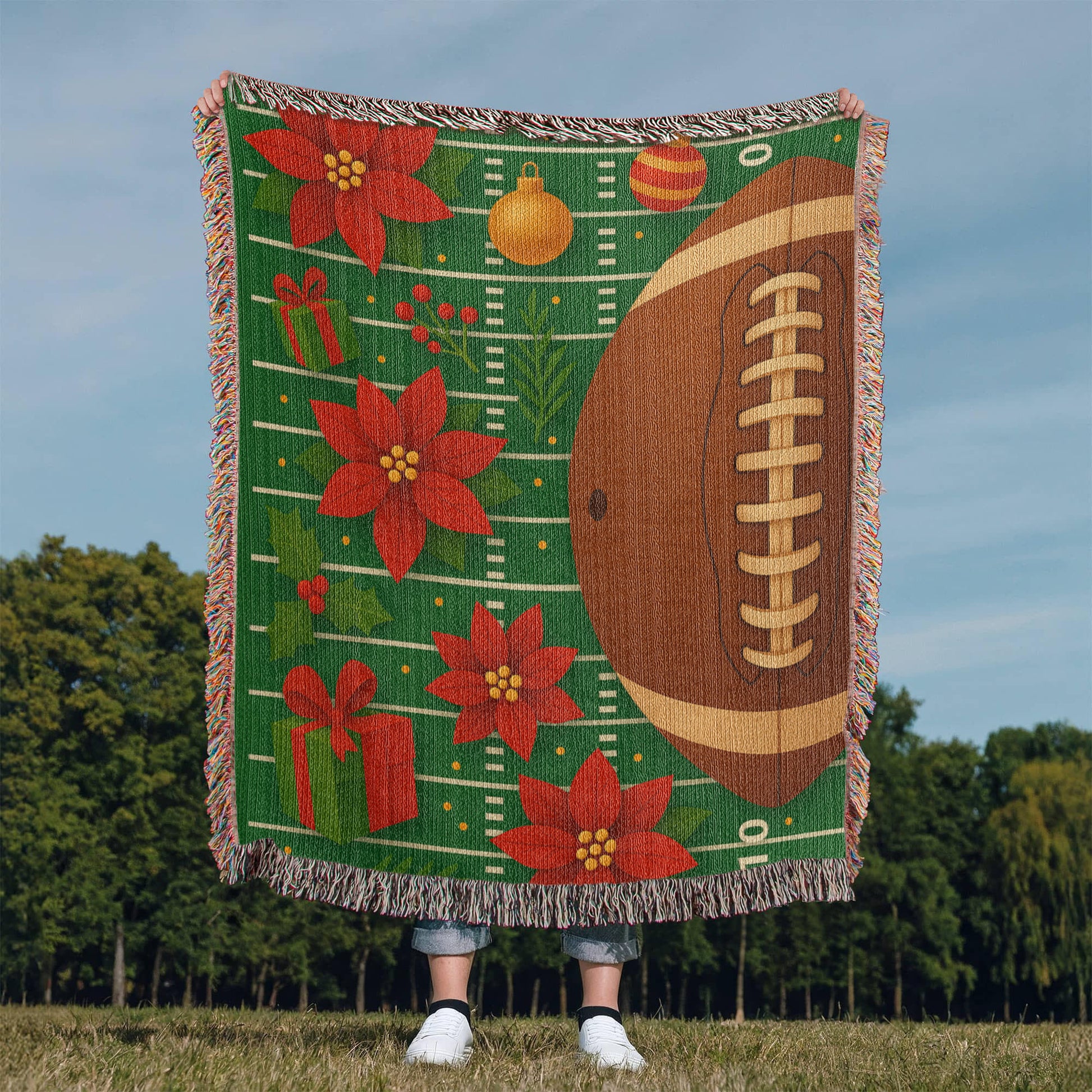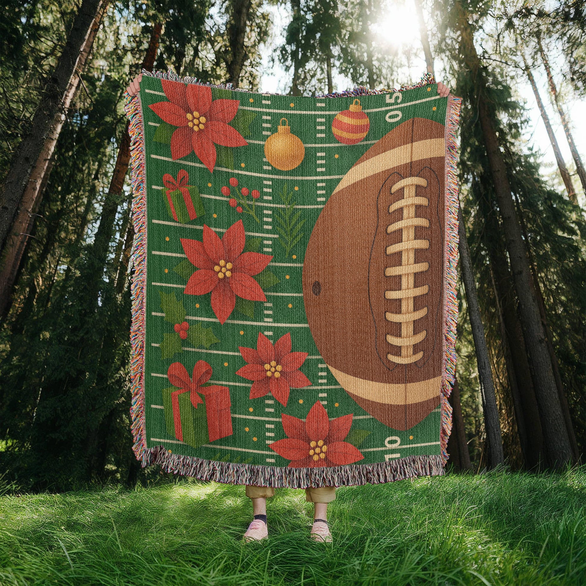 Celebrate the holidays and football season in one perfect blanket. This premium woven throw features a beautifully illustrated football on a field background surrounded by poinsettias, holly, ornaments, and gift boxes β a fun and festive fusion of Christmas spirit and sports energy.