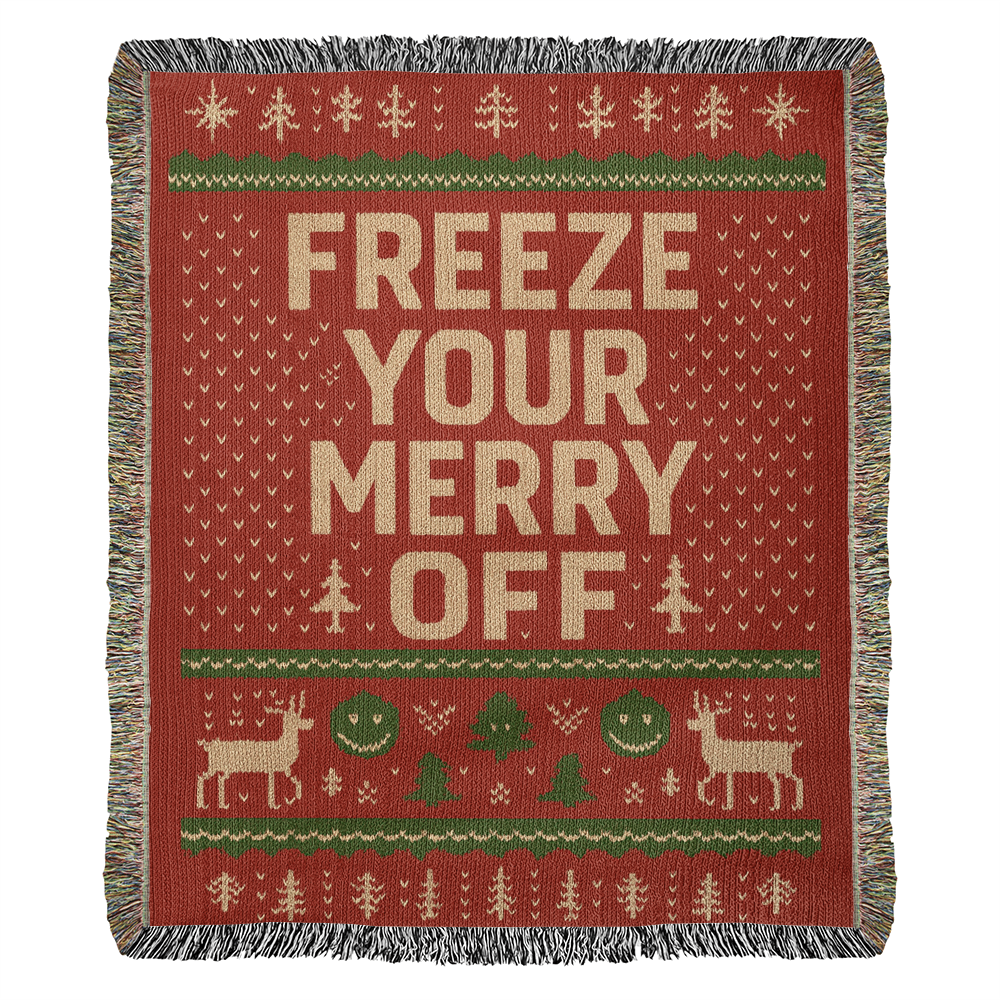 Get ready to outdo every ugly Christmas sweater in the room â but in blanket form. This premium woven throw features the bold, cheeky phrase âFreeze Your Merry Offâ surrounded by classic holiday patterns, reindeer, trees, snowflakes, and vintage winter sweater stitching. Itâs festive, funny, and irresistibly giftable.